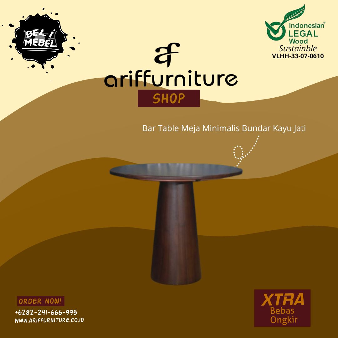 PT. Arif Furnitures Jepara menawarkan beragam pilihan produk furniture Jepara seperti katalog gambar produk Bar Table Meja Minimalis Bundar Kayu Jati, untuk melihat desain & model lain terkomplet dengan harga murah baca di sini : Meja Makan Cafe Kayu Jati Minimalis AF-18. Pembelian dan pemesanan produk furniture Jepara dari kami lewat cara online atau offline gampang, nyaman dan aman bergaransi.