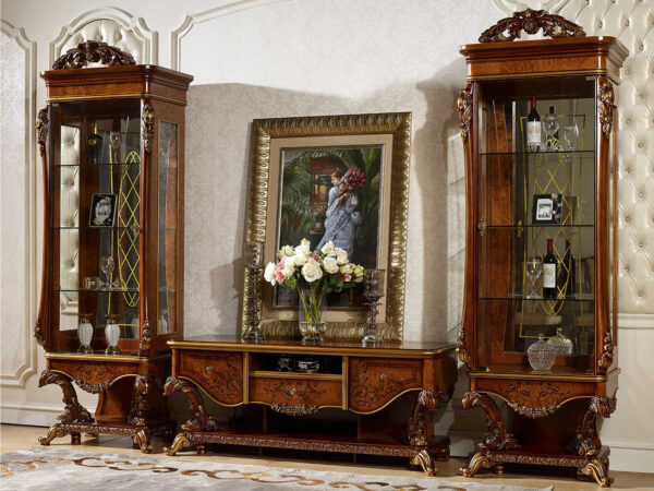 Bufet tv klasik ukiran mewah dengan desain yang simple tentunya berkelas, meja tv klasik ini berbahan dasar kayu jati solid sehingga tidak diragukan lagi kualitasnya. Lemari ini dilengkapi dengan beberapa sekat yang dapat memanfaatkannya untuk menyimpan barang-barang pribadi anda. Dalam set ini juga terdapat pilar laci dengan paduan kaca sehingga dapat gunakan untuk memajang aksesoris atau barang bernilai seni anda.