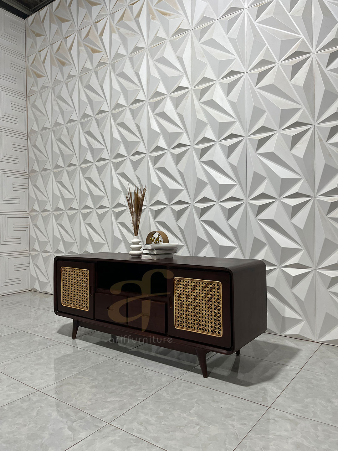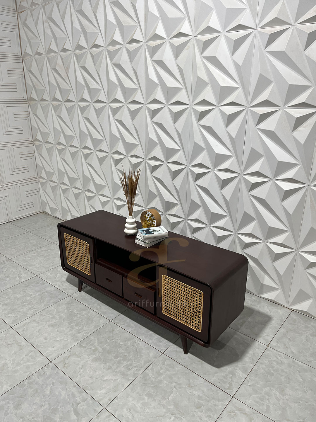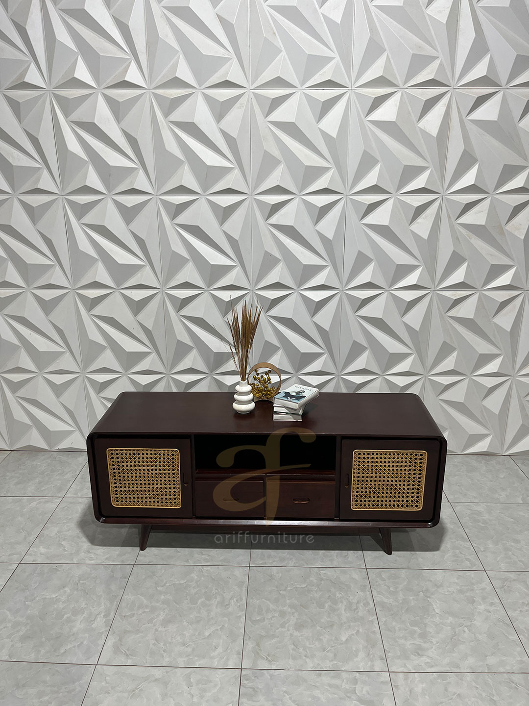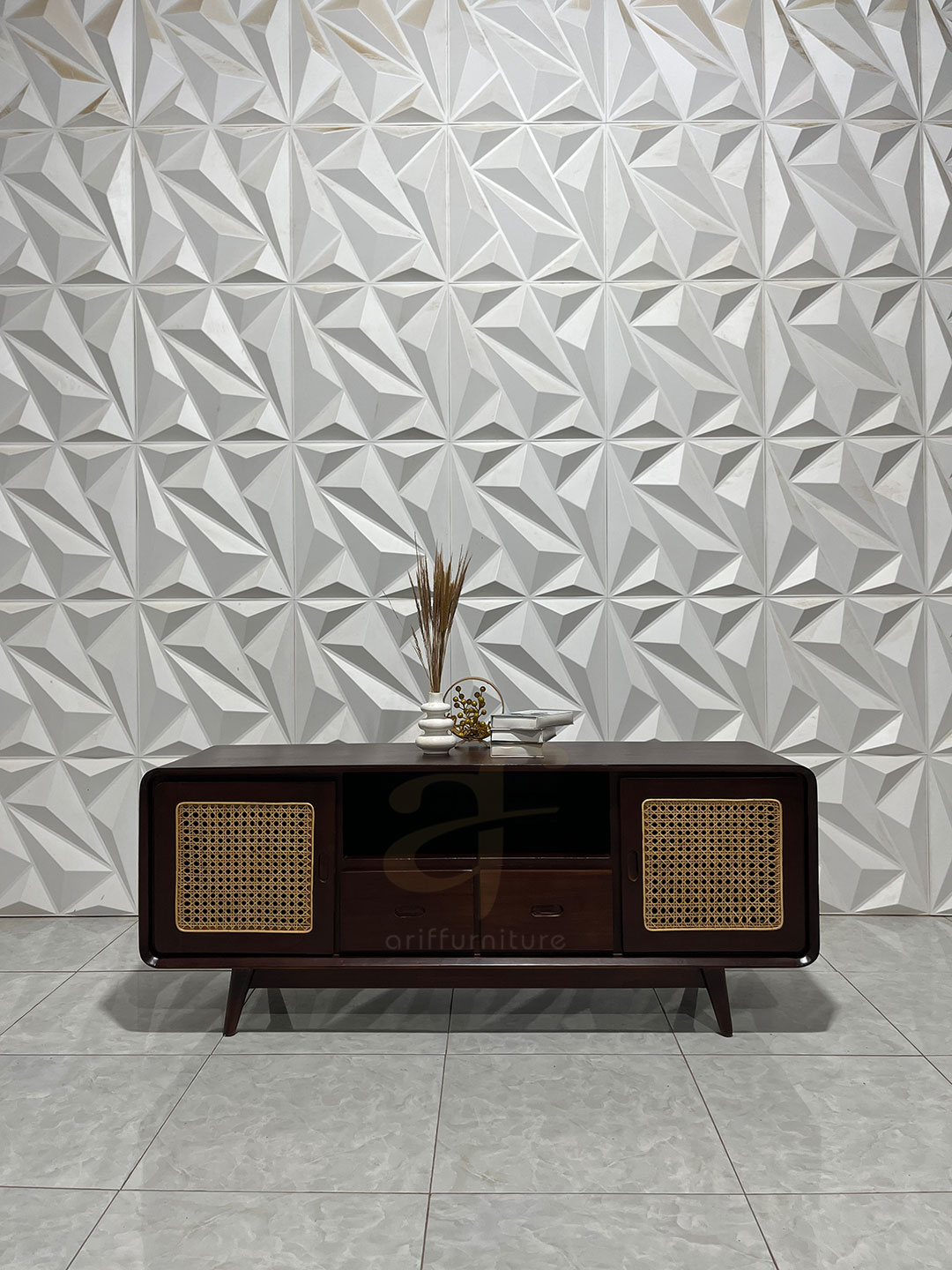 Buffet ini mengusung desain retro klasik yang telah disempurnakan dengan garis-garis minimalis, menciptakan siluet yang bersih namun tetap kaya akan nostalgia. Dibuat sepenuhnya dari Kayu Jati pilihan berkualitas, furnitur ini menonjolkan keindahan serat alam yang hangat dengan finishing natural yang elegan.