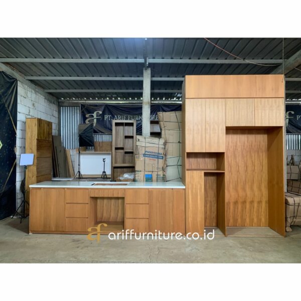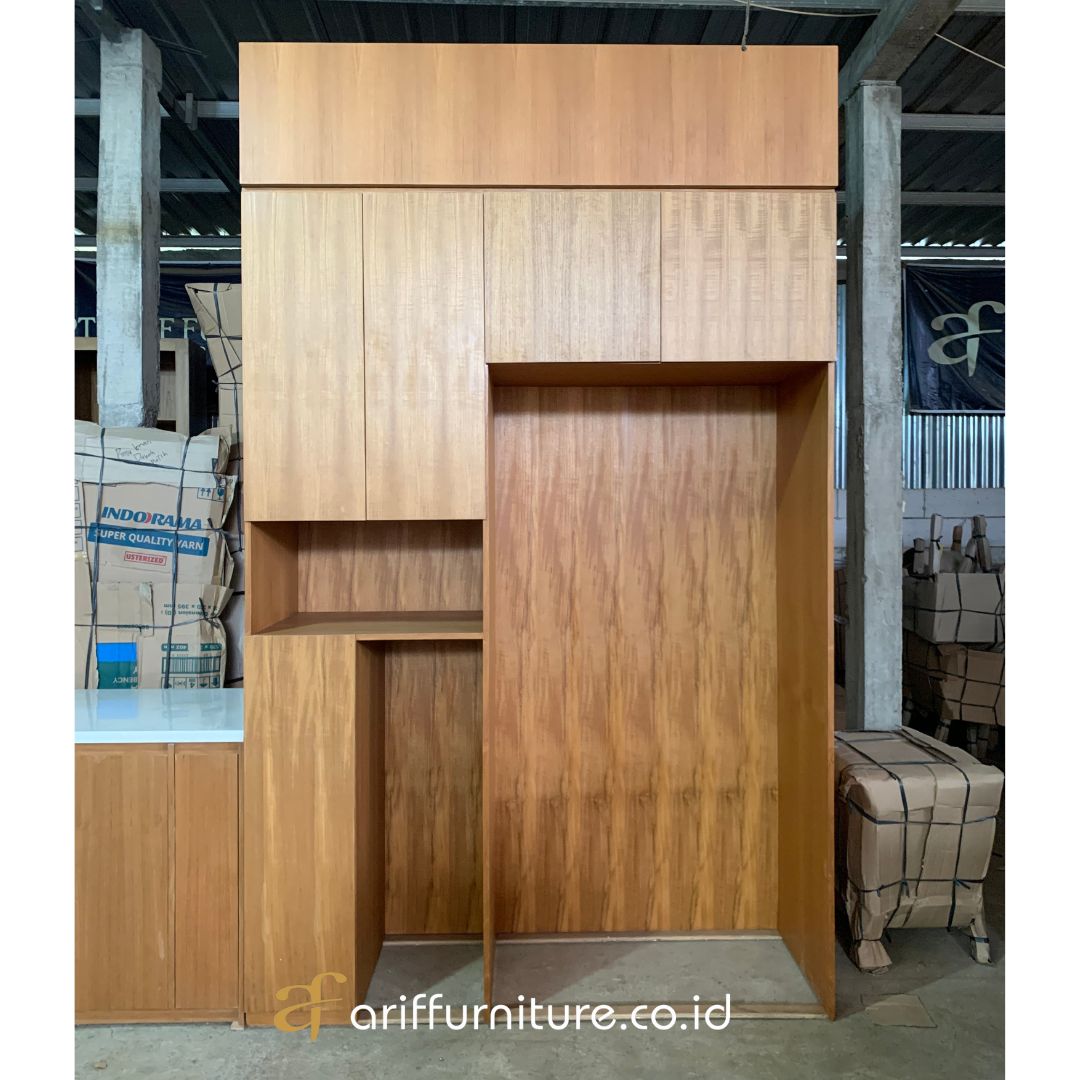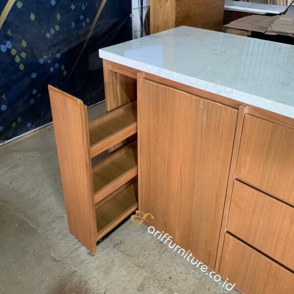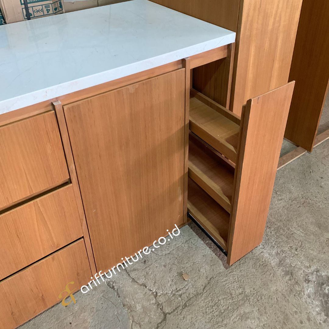 Juga menawarkan banyak manfaat, di antaranya adalah ruang penyimpanan yang efisien dan mudah diakses. Dengan desain yang compact, Anda bisa memaksimalkan setiap sudut ruang dapur. Material veneer jati juga mudah dibersihkan dan dirawat, menjadikannya pilihan tepat untuk dapur yang sering digunakan.