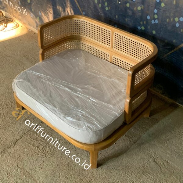 Kombinasi kayu jati dan rotan dalam desain kursi teras santai ini menciptakan estetika yang memikat. Desainnya yang elegan dan harmonis tidak hanya memperindah teras Anda tetapi juga menambah nilai estetika pada ruang luar rumah Anda secara keseluruhan.