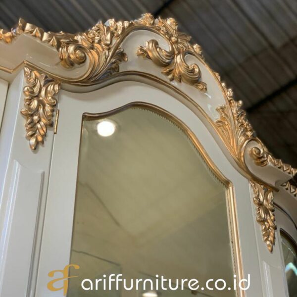 Desainnya yang penuh dengan ukiran tangan yang indah. dibuat dari bahan kayu berkualitas tinggi memberikan daya tahan dan kekuatan struktural pada lemari. Kombinasi antara kaca dan kayu yang diukir menciptakan harmoni yang memukau, menciptakan perpaduan yang sempurna antara fungsionalitas dan estetika.