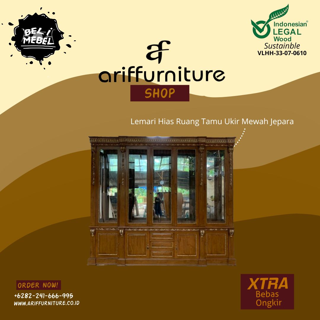 PT. Arif Furnitures Jepara menawarkan beragam pilihan produk furniture Jepara seperti katalog gambar produk Lemari Hias Ruang Tamu Ukir Mewah Jepara, untuk melihat desain & model lain terkomplet dengan harga murah baca di sini : Lemari Hias Ruang Tamu Kaca Antik AF-16. Pembelian dan pemesanan produk furniture Jepara dari kami lewat cara online atau offline gampang, nyaman dan aman bergaransi.