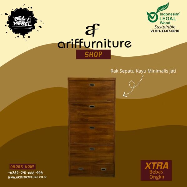 PT. Arif Furnitures Jepara menawarkan beragam pilihan produk furniture Jepara seperti katalog gambar produk Lemari Rak Sepatu Kayu Minimalis Jati, untuk melihat desain & model lain terkomplet dengan harga murah baca di sini : Lemari Rak Sepatu Kayu Terbaru. Pembelian dan pemesanan produk furniture Jepara dari kami lewat cara online atau offline gampang, nyaman dan aman bergaransi.