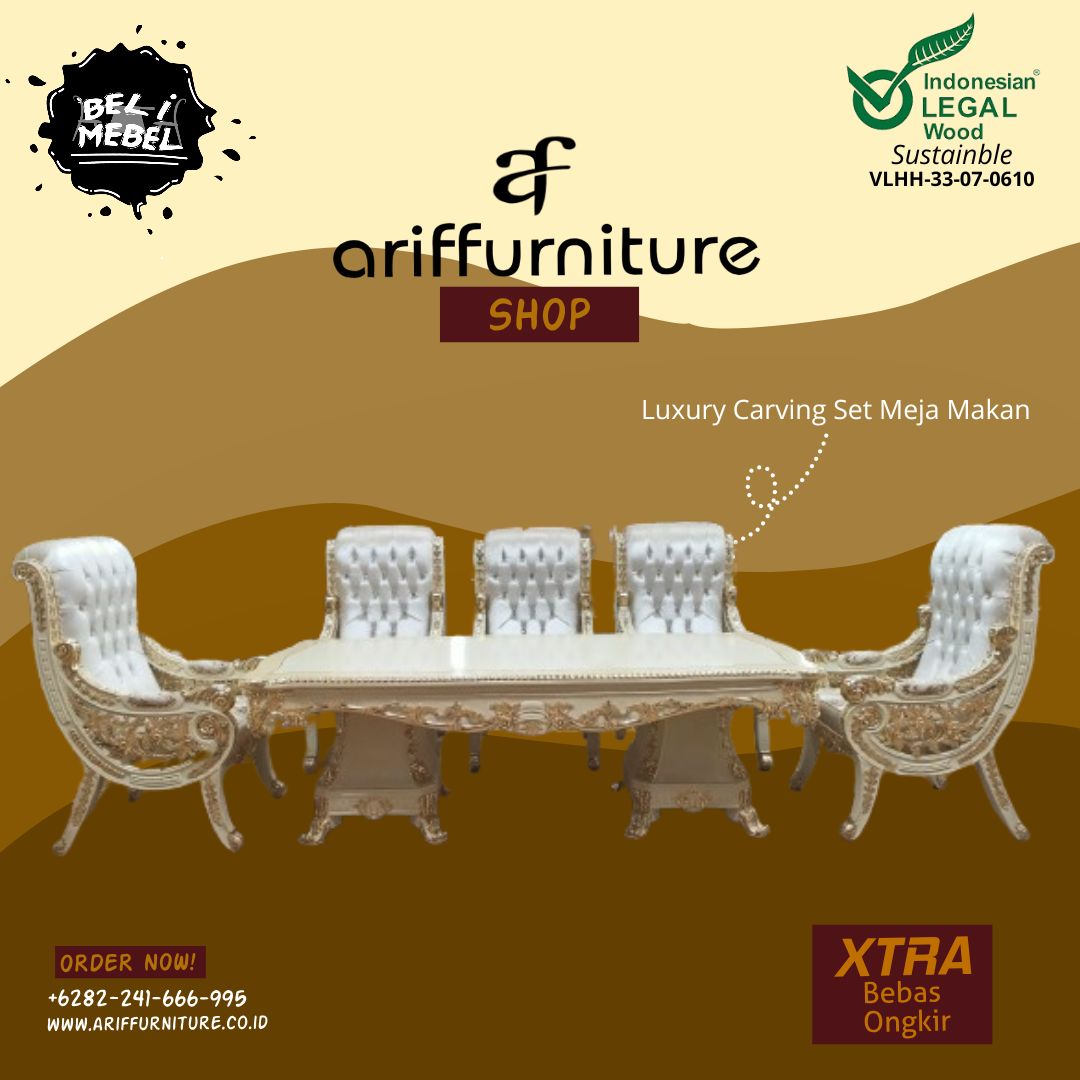 PT. Arif Furnitures Jepara menawarkan beragam pilihan produk furniture Jepara seperti katalog gambar produk Luxury Carving Set Meja Makan Mewah Ukiran, untuk melihat desain & model lain terkomplet dengan harga murah baca di sini : Set Meja Makan Minimalis Putih 4 Kursi. Pembelian dan pemesanan produk furniture Jepara dari kami lewat cara online atau offline gampang, nyaman dan aman bergaransi.