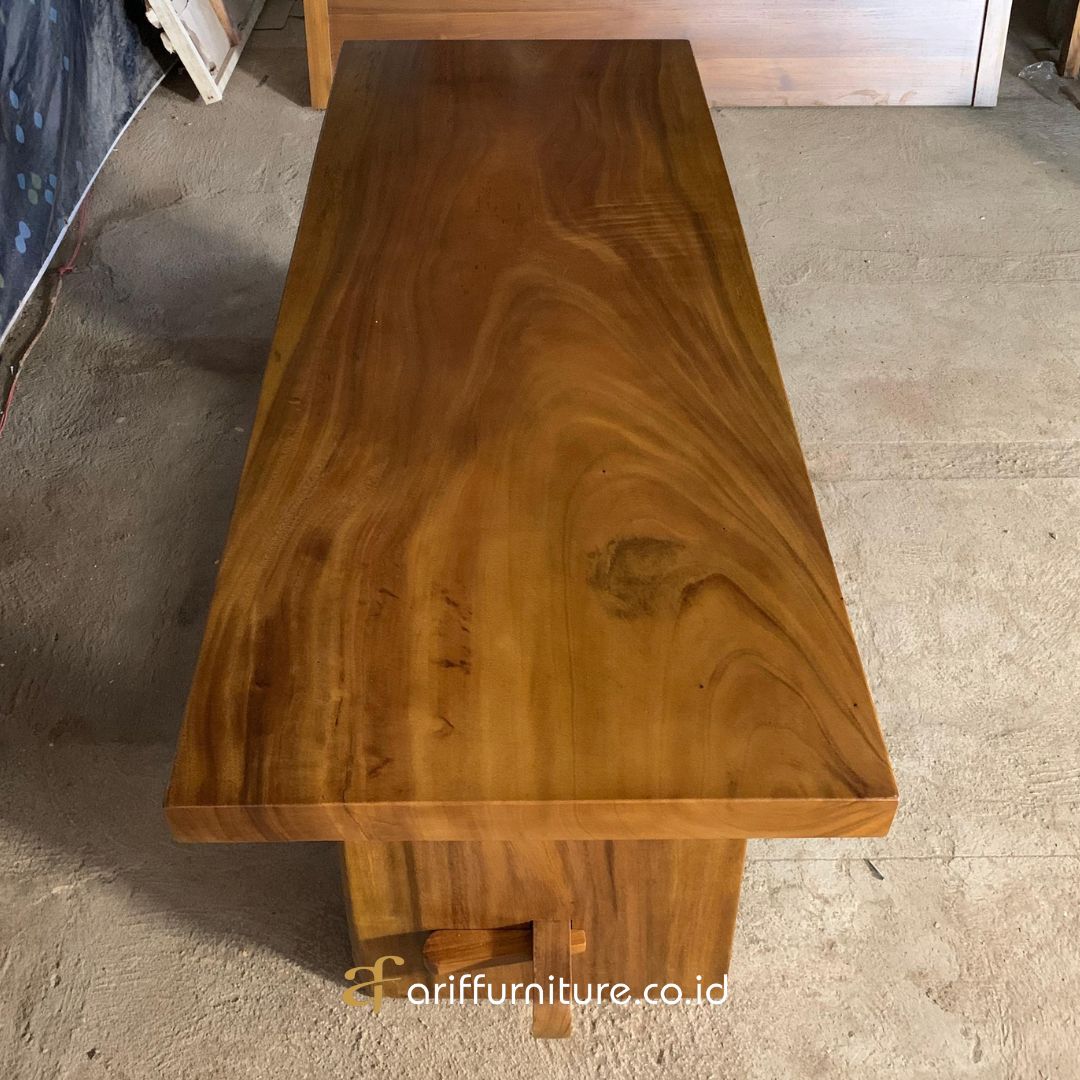 Lengkapilah ruang makan Anda dengan kehangatan dan keindahan alami meja makan trembesi solid. Rasakan keistimewaan menyantap hidangan bersama keluarga di atas karya seni alam yang tak ternilai ini.
