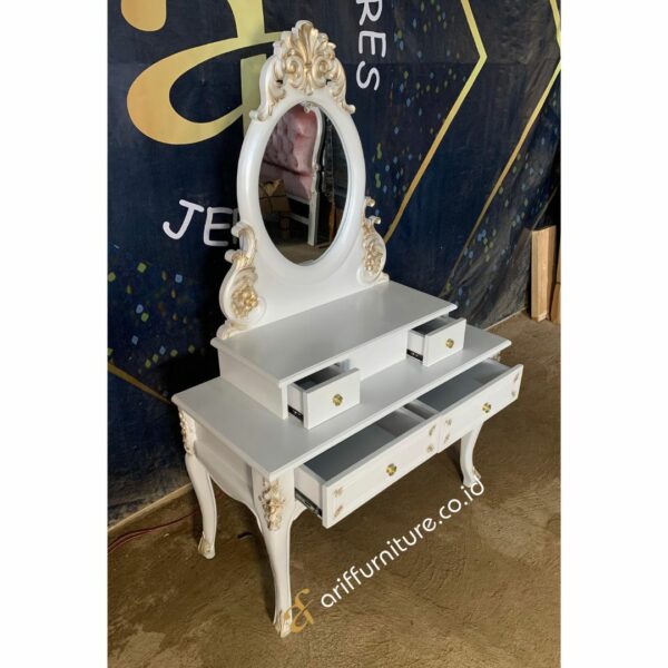 Ukiran emas yang dipadukan dengan warna putih duco memberikan kesan mewah dan elegan pada Produk ini. Selain keindahan visualnya, Juga menawarkan kualitas dan kekuatan konstruksi yang luar biasa. Dengan laci-laci yang luas dan cermin yang besar, meja rias ini menyediakan ruang penyimpanan yang cukup untuk segala kebutuhan perawatan pribadi Anda.